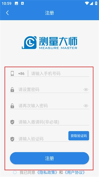 2、在登录页面点击右上角的【注册】按钮,即可进入【测量大师】的注册界面,此界面提供手机号-密码等注册方式。