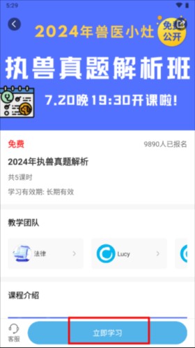 2、向下滑动页面可查看课程大纲介绍,点击报名按钮后会显示“立即学习”选项。