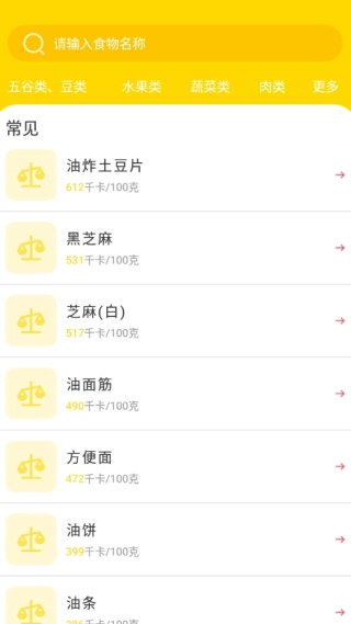 2、点击热量查询,即可在此查看多种食物的热量信息。