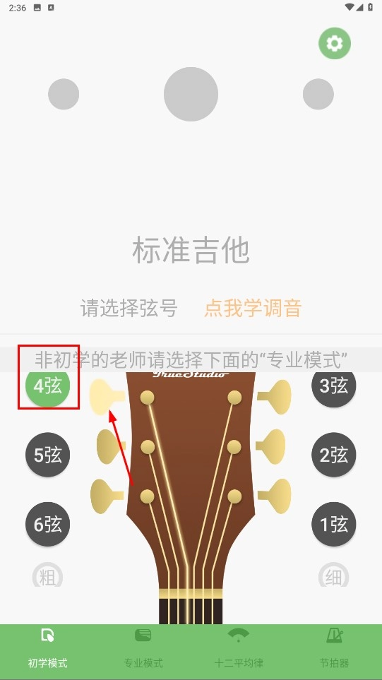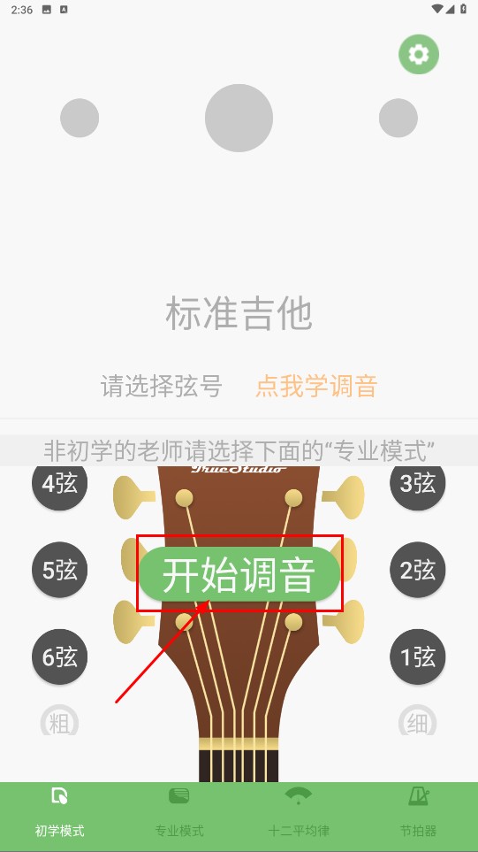 1、点击【开始调音-按钮】,进入吉他调音流程。