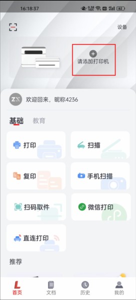 1、启动软件后,界面会呈现基础与教育两大模块,此时选择基础板块,再点击添加打印机的按钮。