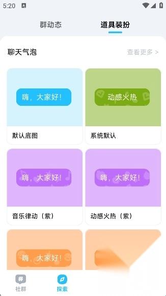 在“探索”页面能够浏览群动态、挑选聊天气泡,还可以查看动态的详细内容以及评分。