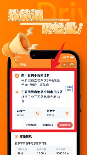 4、在货源详情页面中可查看发货与收货地址,支持快速联系货主并执行运单操作。
