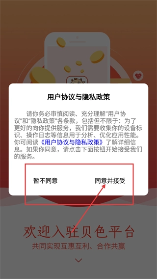进入平台后,会先弹出【用户协议与隐私政策】确认框,需阅读条款后点击【同意并接受】,方可进入后续流程。