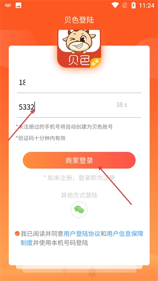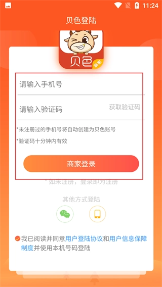 3、填写完手机号和验证码后,点击【商家登录】按钮提交信息,若账号未注册,系统会自动创建为贝色商家账号。