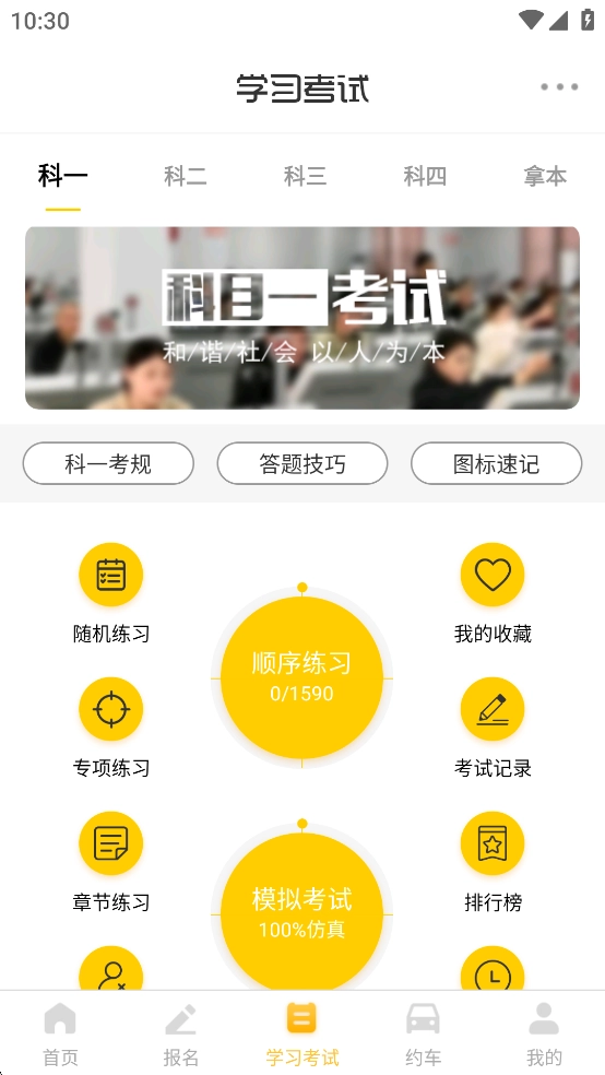 2、学习考试板块提供科目一至科目四全套题库、教学视频,搭配答题技巧与专项练习,助力通过理论与路考;