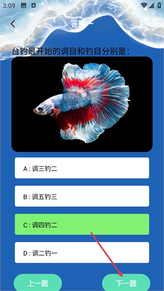 4、点击【下一题】按钮,继续答题,完成钓鱼知识问答操作。