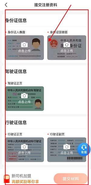 3、输入身份证、驾驶证等相关信息后点击“提交材料”按钮,待审核通过即可完成加入流程。