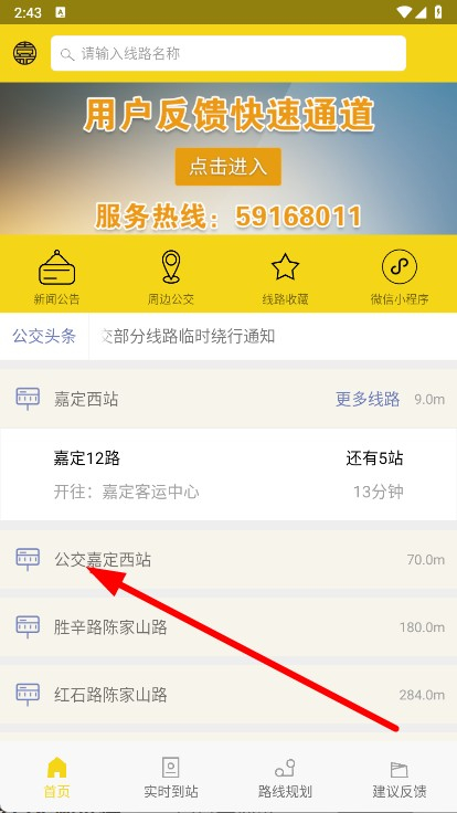 1打开嘉定公交应用后,在初始界面找到并点击你要前往的公交站点,比如嘉定西站公交站。