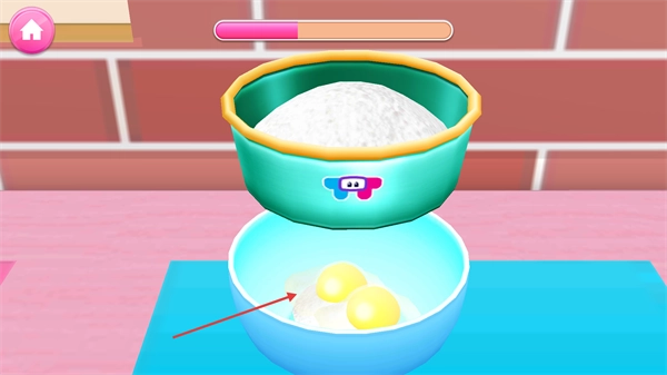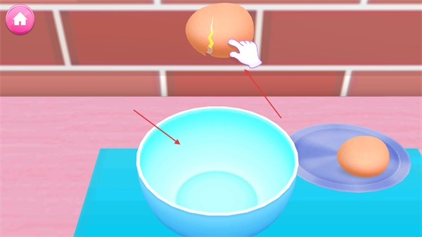 1、按照指引点击带裂纹的鸡蛋,将其处理后,把蛋液倒入容器中,完成这一步的食材准备操作。