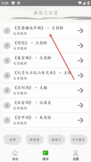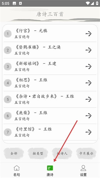 2、在诗词类型菜单中选择【七言绝句】,跳转至对应体裁的诗词列表页面。