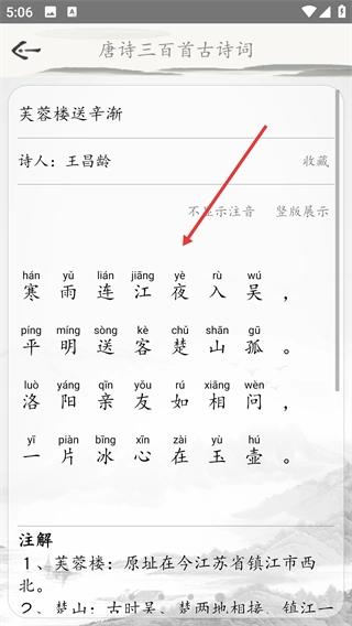 4、在诗词详情页可查看【芙蓉楼送辛渐】的原文、注释等完整内容,了解诗词含义。