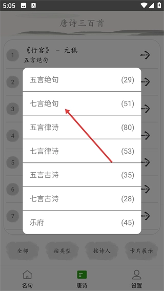 1、点击【按类型】选项,弹出诗词类型选择的交互菜单,可筛选不同体裁诗词。