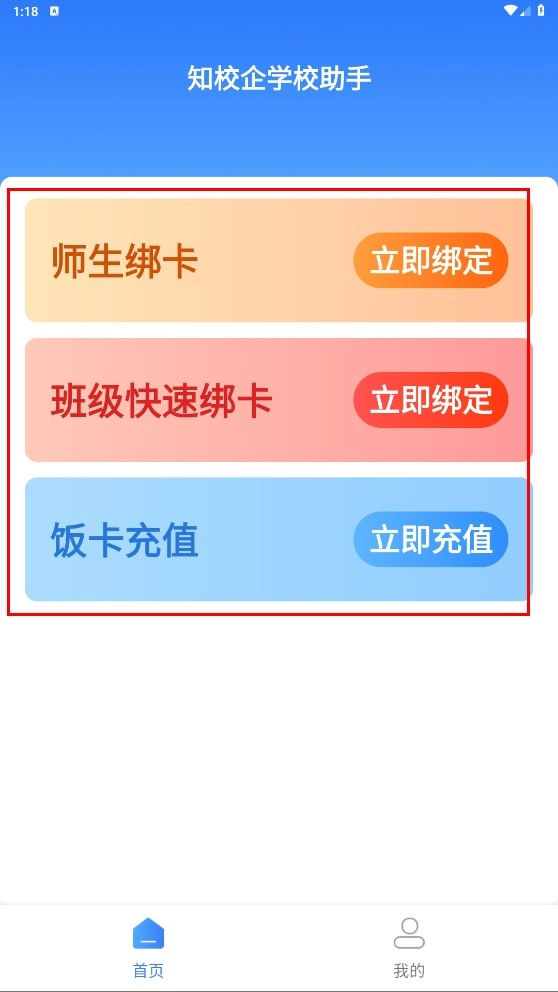 3、根据需求,选【师生绑卡】【班级快速绑卡】【饭卡充值】对应功能,点击【立即绑定】或【立即充值】完成操作。