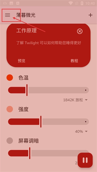 1、点击界面左上角的菜单按钮,可打开【工作原理】弹窗,了解【Twilight】助眠的功能逻辑,也能调整色温、强度等参数。