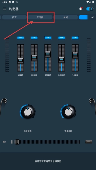 1、打开均衡器应用,选择开阔音效模式并切换至该音频效果,以此调整音乐风格。