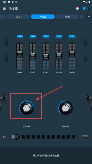 2、音效与风格调节:进入均衡器主界面后,既可以手动拖动滑块来调整不同频段的参数,也能点击预设的音乐风格一键应用;要是想要增强低音效果,还可以开启“低音增强”功能并对其强度进行调节。
