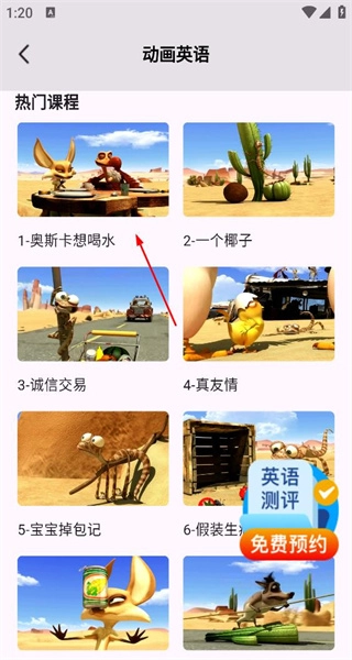 3、在动画英语界面,点击热门课程中的奥斯卡想喝水,可进入该课程的学习页面。