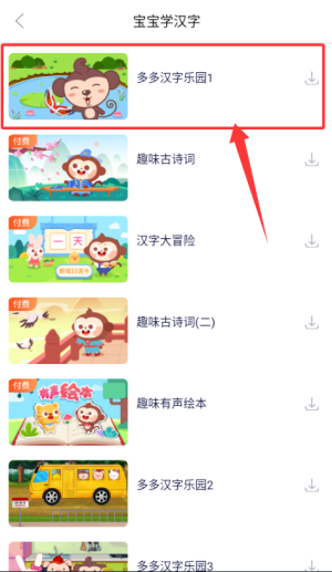 3、选取具体课程如多多汉字乐园1,进入内容页面。