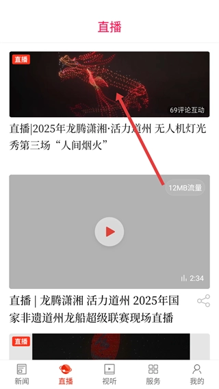 2、在直播页面,选择如“2025年龙腾潇湘·活力道州 无人机灯光秀第三场‘人间烟火’”的直播,点击进入。