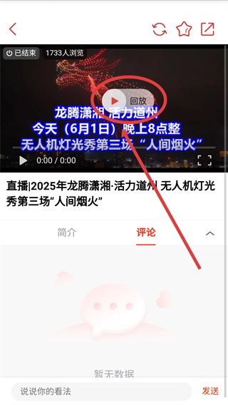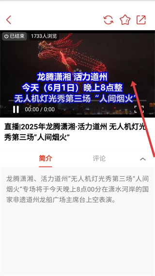 4、在直播回放页面,可查看简介了解直播详情,如无人机灯光秀的表演时间、地点等信息。