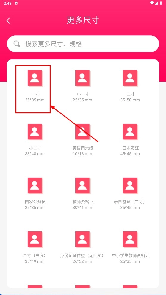 2、在尺寸选择界面,选择所需证件照尺寸,如【一寸25*35mm】,进入拍摄环节。