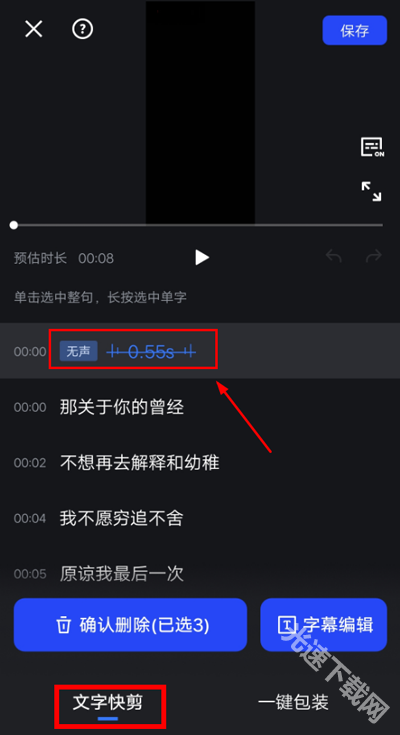 3、【文字快剪】具备智能识别视频内容的功能,能精准定位语气词、无声片段和重复片段;用户只需选中这些内容,就能一键删除,从而快速提升剪辑效率!