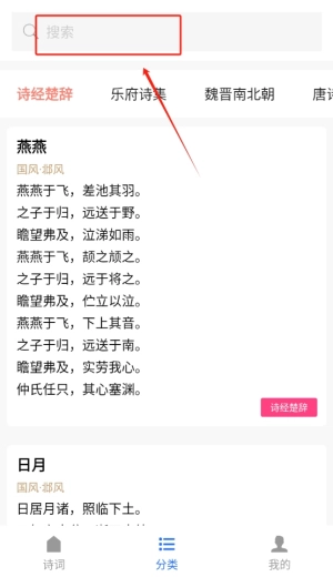 2、搜索栏的设计使得用户可以直接输入关键词,快速精准定位所需诗词,避免繁琐的查找过程,使学习变得更加高效和顺畅。
