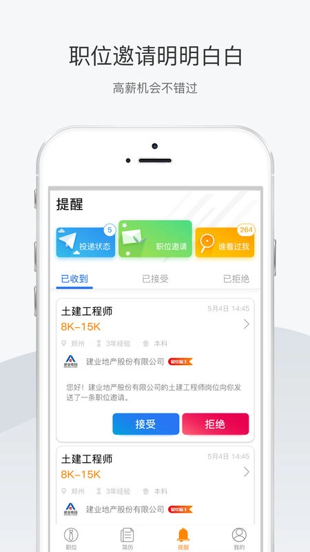 3招聘方会主动向你发出面试邀约,合适的工作机会主动靠近,双方可以互相筛选,招聘方选择你的同时,你也能自主挑选招聘方。