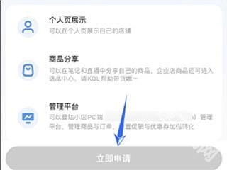 6. 在小红书薯店的申请页面中,需先完成各项申请条件的要求,之后点击“立即申请”按钮,就能成功完成开店流程。