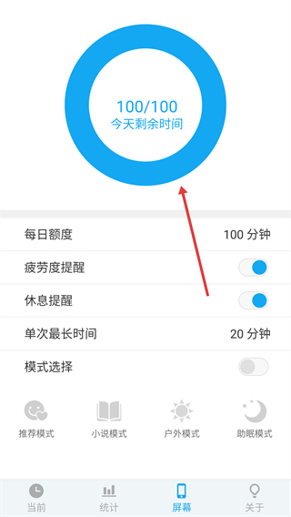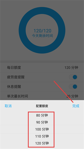 4、选择完成后,即可查看设置后的每日剩余时间(如100/100)。