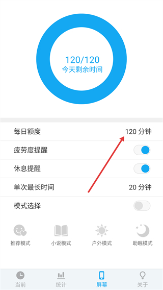 2、在屏幕设置页面点击【每日额度】选项,弹出额度配置菜单。