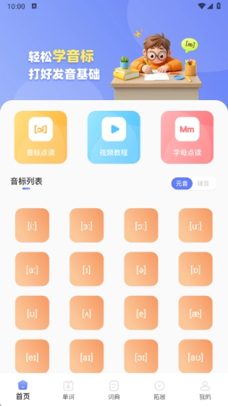 首页设有音标点读、视频教程、字母点读等功能模块,用户也能在此查看完整的音标列表。