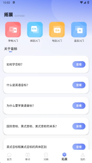 4、拓展页面涵盖了字母入门、词法入门、句法入门和语法入门等方面的知识。