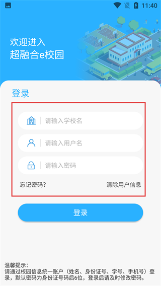 3、登录界面需依次填写【学校名】【用户名】【密码】,默认密码为身份证后6位,填写完成后点击【登录】即可进入系统。
