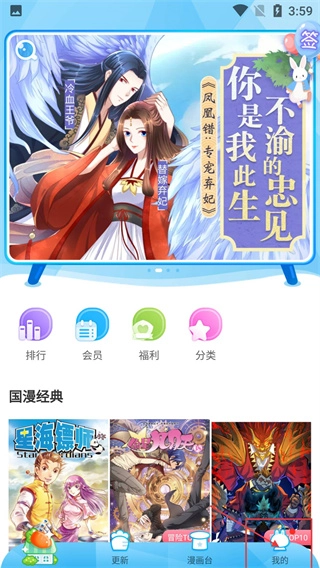 1、在漫画应用首页,点击底部【我的】选项进入个人中心,该应用提供国漫经典、排行、会员等漫画相关功能。