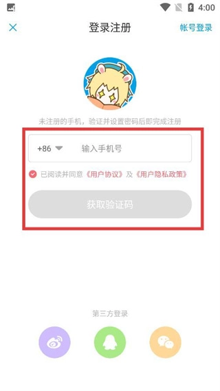 3、进入登录注册页后,输入【手机号】,点击【获取验证码】即可向该手机号发送验证短信。