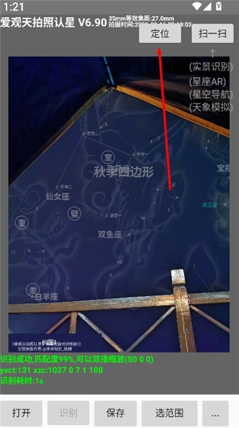3、识别天体:等待几秒钟,软件会自动识别出拍摄到的天体,并显示相关信息。