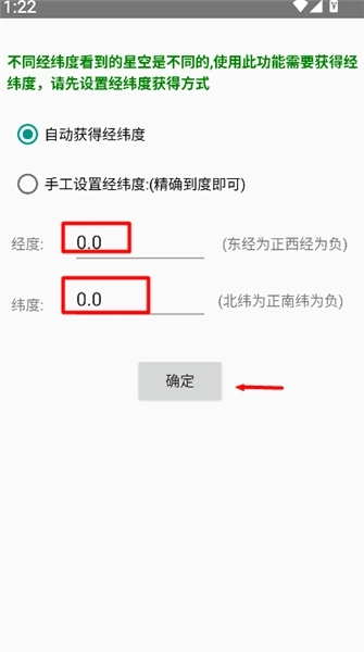2、在定位设置页面中,手动输入经度与纬度数据,并点击“确定”按钮,完成精确位置的设定,以确保星图显示与真实方位一致。
