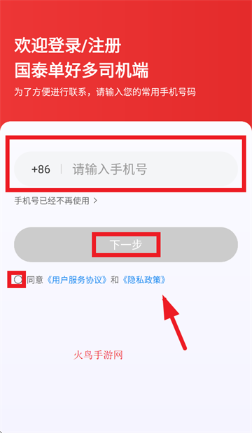 进入登录页面后,先填写手机号码,再勾选同意《用户服务协议》和《隐私政策》,最后点击“下一步”按钮继续操作。