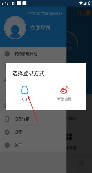 3、在登录方式选择界面,看到QQ和新浪微博选项,点击QQ,准备进行账号登录操作。