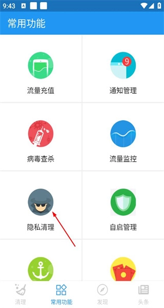 4、登录后进入常用功能页面,看到流量充值、隐私清理等功能,点击隐私清理,开始进行隐私数据清理操作。