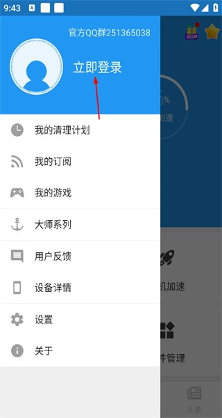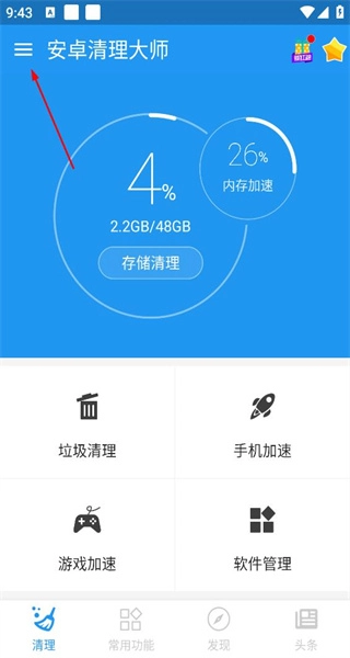 1、打开安卓清理大师,进入清理主界面,显示存储和内存加速信息,点击左上角菜单,进入功能列表页面。