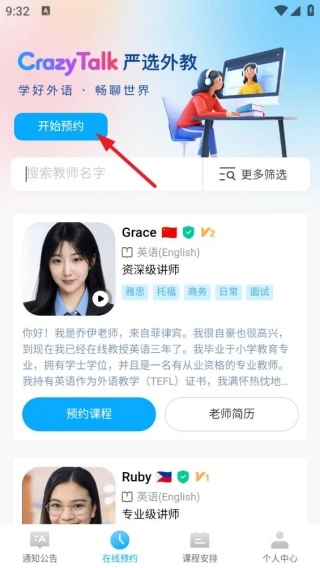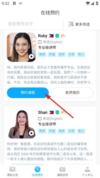 2、平台提供了详细的老师简介内容,便于大家直接预约该老师的课程。