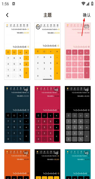 4、进入主题设置页面,展示多款计算器主题样式,挑选喜欢的主题样式后,点击右上角确认按钮应用该主题。