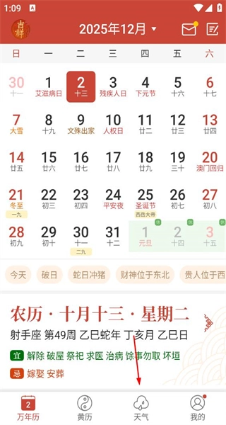 1、打开软件后,查看2025年12月日历及黄历信息,点击天气按钮进入添加城市页面。
