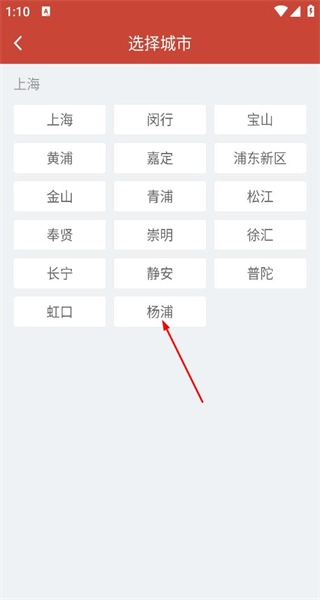 3、进入上海的城市选择页面,查看各区域选项,选择杨浦区域进入该区域的天气展示页面。