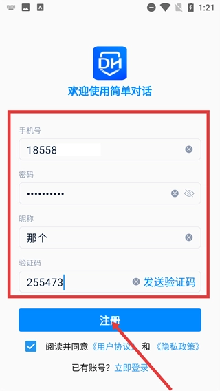 3、进入注册页面后,依次填写手机号、密码、昵称并输入验证码,随后点击【注册】按钮,即可完成账号注册操作。