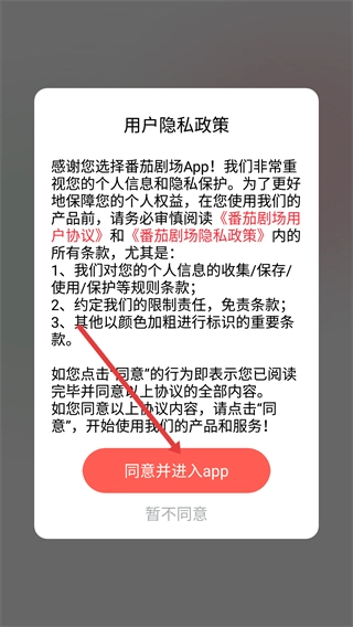 1、仔细阅读《番茄剧场用户协议》与《番茄剧场隐私政策》的各项条款后,点击“同意并进入”按钮,即可进入应用的后续界面。
