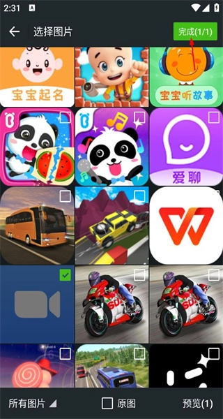 3、进入图片选择界面,勾选需要的图片后点击完成,该界面会呈现多款不同主题类型的图片。